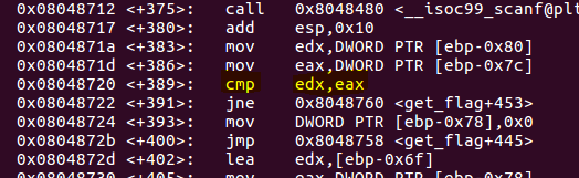 GDB로 해당 바이너리를 열고 주요함수인 get_flag 함수를 살펴보면 get_flag+389 명령어가 cmp edx,eax
