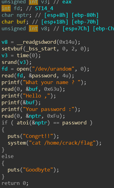 바이너리를 아이다로 열어보면 password의 값과 입력값이 같으면 flag를 읽어준다. 그위에 printf(&buf)가 보이는데 이부분에서 fsb가 발생을 하기 때문에 이 fsb를 이용해 password를 0으로 값을 바꿔준 후 패스워드를 물어볼 떄 0을 입력하면 끝!